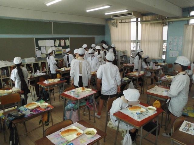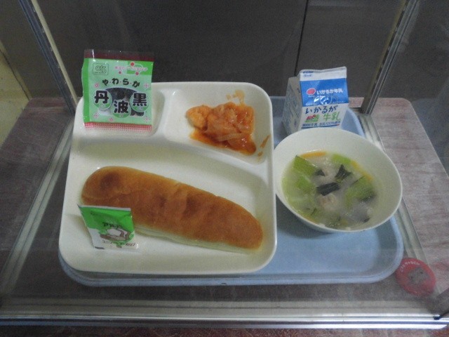 今日はちょっと珍しい「中華がゆ」でした。とろとろのお粥は、疲れた胃腸にも優しく染み渡ります。そこに、ちょっぴりピリ辛な「えびのチリソース炒め」を合わせると、もう最高!甘いソフト黒豆も良いアクセントになっていました。コッペパンにマーガリンを塗って、お粥とパン、両方の美味しさを楽しんだお昼時でした。