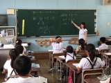 8月29日、1年1組に、5.6年生に英語を教えているアダム先生が、給食を食べに...