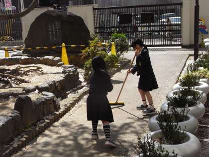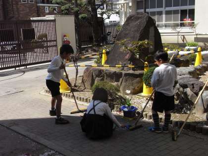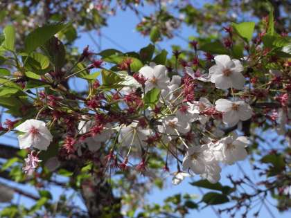 4月15日(月)、昨日の雨でさくらの花びらもずいぶん散ってしまいました。掃いても掃いても、・・・の状態です。花に代わって、枝には若葉がどんどん出始めています。