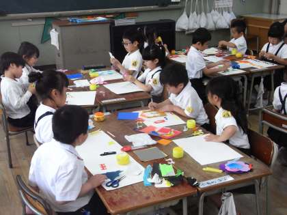 5月29日(水)、1年生は図工科の学習で、折り紙を折り重ねて切り開くことで,同じ形がつながる面白さを生かして,つながる形を発想しながら折り方や切り方を工夫し,形や色,大きさなどをイメージに合わせて表現しました。