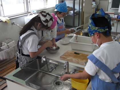 5月29日(水)、5年生は家庭科の学習で、卵とほうれん草を使って、初めての調理実習をしました。