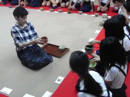 座礼の仕方やお茶のいただき方など、一つ一つていねいに作法を教えていただきました。そして、作法に則って、季節を感じさせる主菓子と抹茶をいただきました。