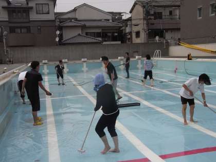 6月18日(火)、教職員がプール清掃をしました。来週6月24日(月)のプール開きを前に、プールの内面やプールサイド、更衣室など、きれいに磨いて砂やコケなどを落としました。