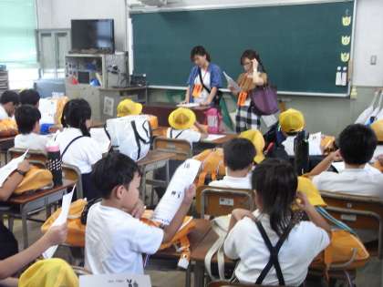 分団の教室では、この日は特別に、子ども会の世話役の保護者の方にお越しいただき、1学期の集団登校の反省をしたり、夏休み中の子ども会の行事などについて説明していただいたりしました。