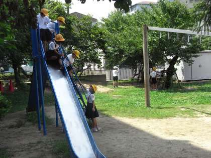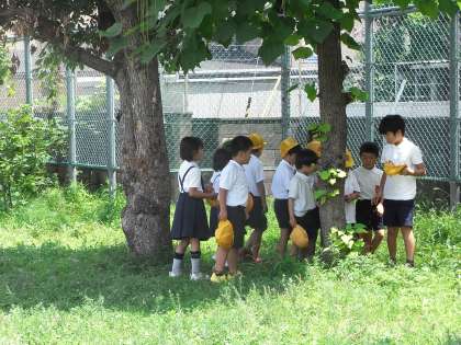梅雨空の続く毎日ですが、運動場が使える時は、元気いっぱい遊んでいる子どもたちの姿があります。アスレチックゾーンでは、早くもクマゼミを見つけた子どももいました。