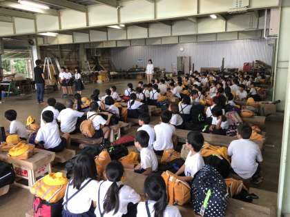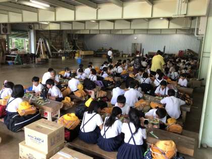 開舎式でお世話になる宿舎の方へご挨拶をして、お昼ご飯のお弁当を食べています。