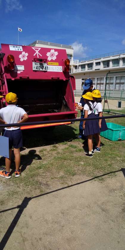 2時限目は、パッカー車でのごみ収集について教えていただいたあと、実際にごみをパッカー車に入れる作業を4人一組で行いました。家庭ごみ収集時の音楽が集めるごみによって違いがあること等の説明もしっかり学習することができました。
