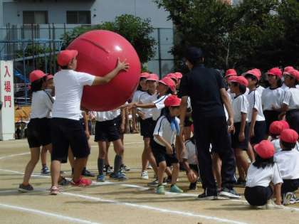 午後の競技は、児童会競技「大玉送り」でした。1年生から4年生は、大玉を転がしながら送りました。5年生と6年生は、大玉を頭上でつきながら送りました。