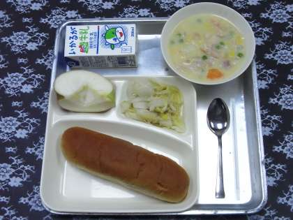 今日の給食の献立は、黒糖パン、コーンクリームシチュー、はくさいのピクルス、りんご、牛乳でした。食物アレルギーに配慮した献立で、コーンクリームシチューに使用のとろみは、上新粉を使用し、小麦粉は使用していません。