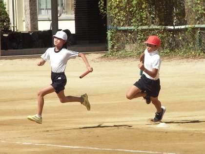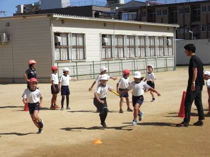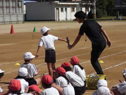 「腕の動き、足の上げ方、姿勢」という大切な3つのポイントを繰り返し練習し、走り方を改善していきました。そして、リレーのバトンパスの仕方についても教えていただき、全員でリレーをしました。