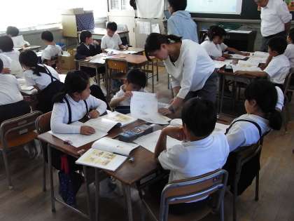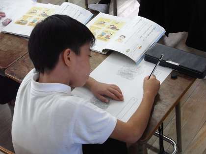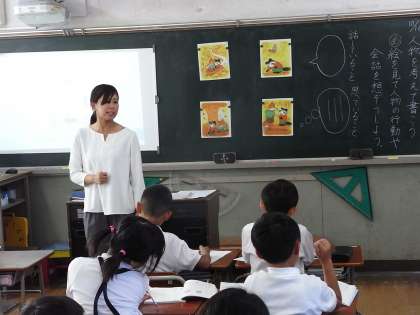 この日の授業では、4枚の絵から、人物の出来事や会話を想像し、物語の内容の大体を考えました。