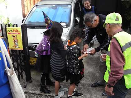 今津中学校のジュニアリーダーにも加わってもらい、グループに分かれて歩きました。ハロウィンイベントなので、もちろん仮装もOKです。訪問した「こども110番の家」では、スタンプカードへシールを貼ってもらいました。