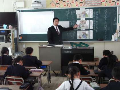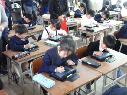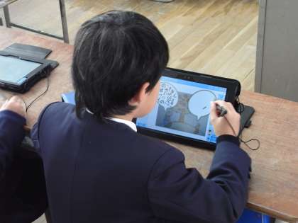 2年生の国語では、タブレット端末を使って、4枚の絵のお話がつながるように吹き出しを考えました。