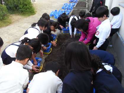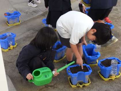 11月20日(水)、1年生が植木鉢にチューリップの球根を植えました。植木鉢に花壇の土を入れ、球根を浅めに植えました。そして、たっぷりと水をあげました。春先にきれいな花が咲くのが楽しみです。
