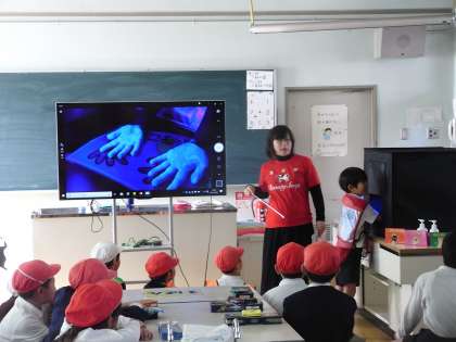 次に、汚れの広がり具合の実験としてグループでトランプを使ったゲームをしました。ゲームの後に代表者以外のメンバーの手をUVライトでチェックし、汚れの広がりを確認しました。トランプも汚れていないかチェックし、全員がしっかりと手洗いしないと汚れは広がってしまうことを学びました。