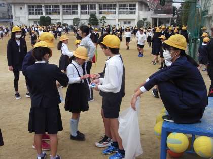 11月25日(月)、児童集会で「宝さがし」をしました。赤組・白組に分かれて、運動場に隠されたカードを探します。カードを探し出したら、朝礼台の所まで持って来ます。カードは折り紙と交換です。どちらの組が、たくさんのカードを見つけることができたでしょうか。