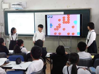 11月27日(水)、各グループでゲーム会社をつくり、プログラミングソフトの「viscuit」を使ってオリジナルゲームを作りました。そして、それぞれのゲームのプレゼンテーションをし、、「ゲームの面白さ」や「プレゼンテーションの工夫」「商品の広告」などの観点から「今津ゲーム大賞」を決めました。