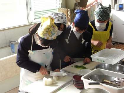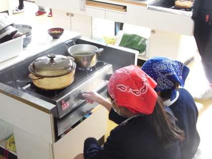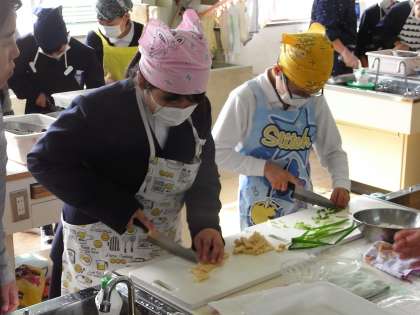 12月13日(金)、5年生は、家庭科の調理実習で、ごはんとみそ汁を作りました。みそ汁の出汁を取るための煮干しは、1尾ずつていねいに頭とはらわたを取りました。具材には、油揚げやねぎ、だいこんを入れました。手を切らないように、包丁を使って慎重に切りました。