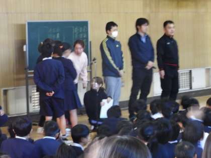 12月23日(月)、朝の児童集会で「声あてクイズ」をしました。先生たち3人が登場し、後ろを向いて、だれが話しているのか分からないようにして一人だけマイクを通してあいさつをします。さて、あいさつをしたのは、3人のうち誰でしょうか?