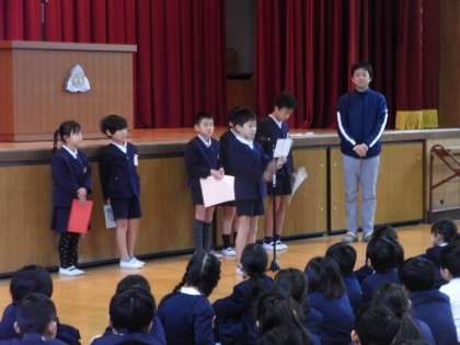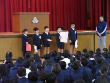 続いて、各学年の代表の児童6名が、今年の目標を書いた「目標かるた」を発表しました。