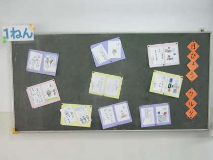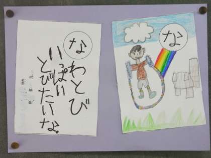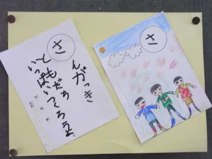 2学期の終わりに、または冬休みに、一人一人今年の目標を考え、目標カルタや俳句に表しました。「さんがっき ともだちいっぱい つくろうよ」「なわとび いっぱい とびたいな」などです。代表の児童は、始業式でみんなの前で発表しました。
