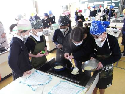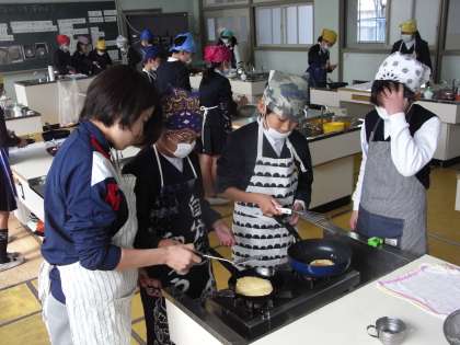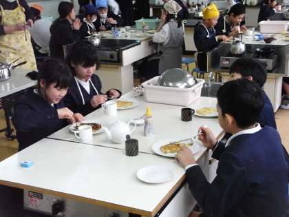 1月31日(金)、5年生では、家庭科でパンケーキを作りました。材料は、米粉、ベーキングパウダー、卵、砂糖、塩などです。焼き加減に気を付けながら焼きました。シロップをかけて、紅茶とともにいただきました。グループでの団らんも弾みました。
