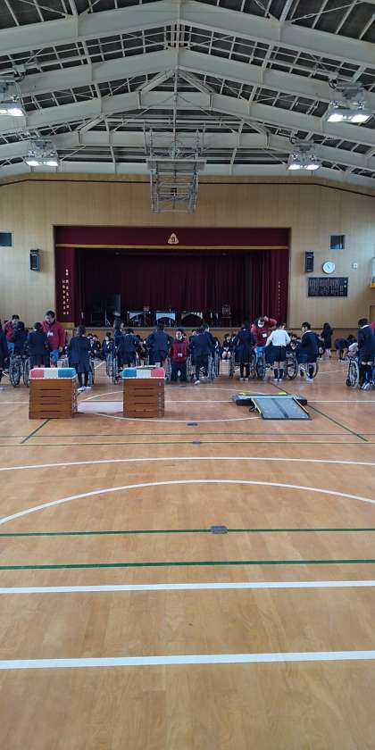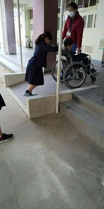 リハビリテーションセンターの方から、車いすの取り扱い方をはじめ、段差やスロープの通り方などを学び、グループに分かれ実際に車いすを押す体験をしました。車いすに乗っている人が安心して乗っていられるように声掛けをしながら一生懸命に押していました。