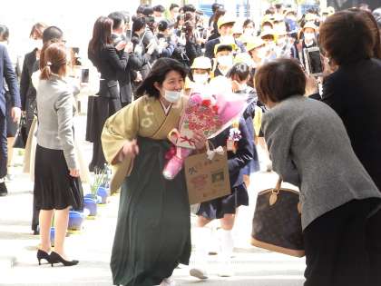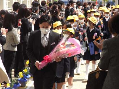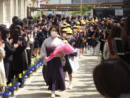 2年生が育てたラッパスイセンの花道を笑顔いっぱいで通りながら、6年生は巣立っていきました。