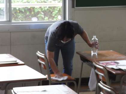 奇数グループ、偶数グループがそれぞれ下校した後は、学級担任をはじめとして教職員が分担して、机やいす、廊下の手すり、トイレのドアノブなどを、消毒していきました。