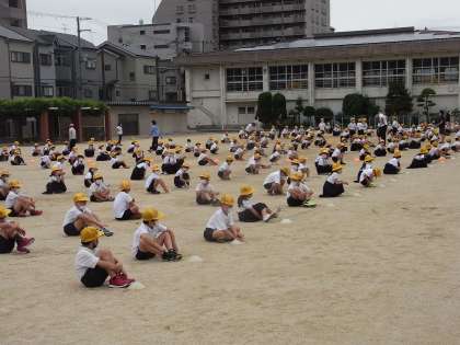1時限目、約290名の児童が運動場全面に整然と並んで、今年度本校に着任した教職員の着任式と始業式を行いました。