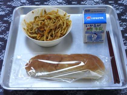 そこで、この期間のメニューは、「パン・牛乳・副食1品」となります。パンは、個包装されています。今日のメニューは、「おさつパン・牛乳・スパゲッティミートソース」でした。