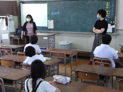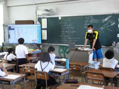 4年生の外国語活動では、C−NETの先生と初めての対面です。みんなで、C−NETの先生の好きな動物やスポーツなどを当てました。