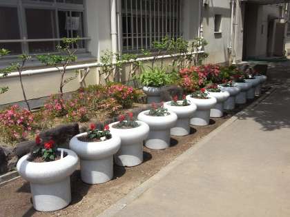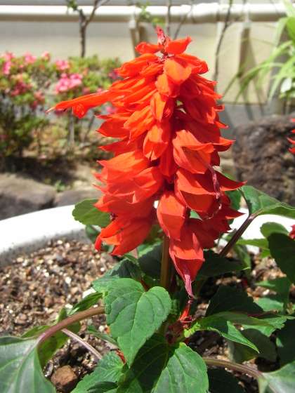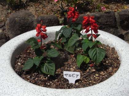 玄関の丸型プランターに、真っ赤なサルビアが咲き並んでいます。昔は肉の臭み消しや料理の味付けに利用されていたそうです。しばらくは、私たちの目を楽しませてくれることでしょう。