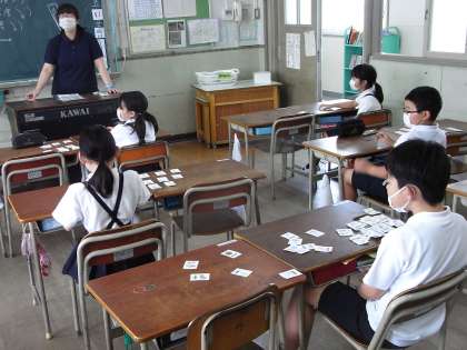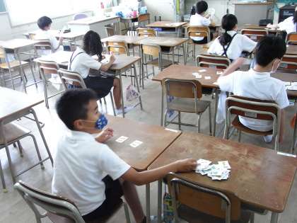 臨時休業中の課題として、地図帳などを見ながら各都道府県の特徴を読み札に書きました。取り札には、各都道府県の形が書かれています。先生が子どもたちの書いた読み札を読み、各々机の上に並べた取り札を取りました。