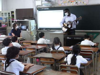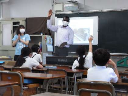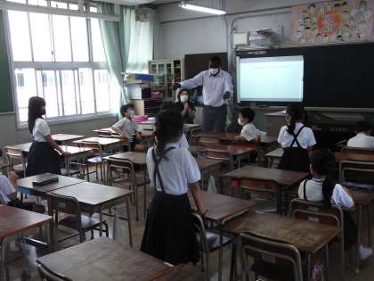 3年生は、外国語活動の授業を担当してくださるC−NETのことについて、コミュニケーションしながら教えてもらいました。出身国はカメルーン、趣味は読書とギターを弾くことだそうです。1年間、楽しみですね。