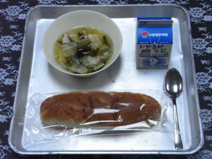 6月12日(金)、今日の給食のメニューは、「おさつパン、牛乳、すまし汁」でした。すまし汁には、キャベツ、えのきだけ、わかめ、かまぼこなどの具材が入っていました。だしこんぶやけずりぶしの香りがとてもよかったです。おさつパンは、やわらかくてふわふわでした。