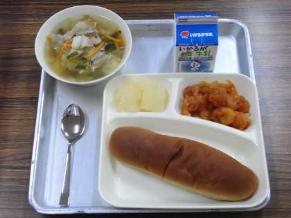 6月15日(月)、今日の給食のメニューは、「黒糖パン、えびのチリソース、中華スープ、和なし(カット缶)、牛乳」でした。