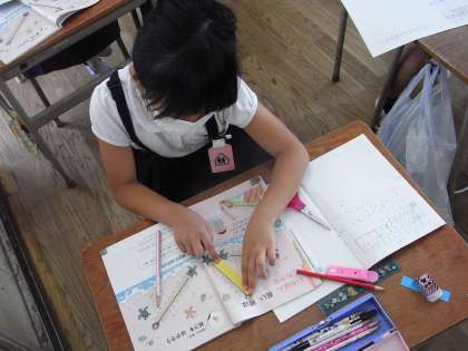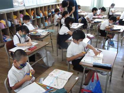 6月16日(火)、2年生は算数科の学習で、テープを使って3本の線の長さを比べました。