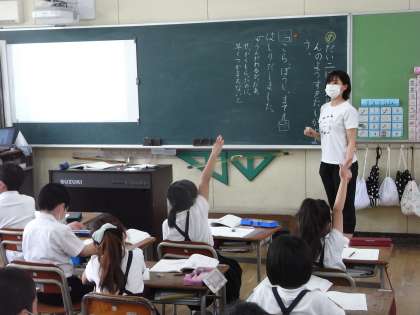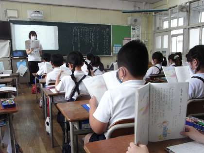 6月18日(木)、2年生は国語科の学習で、教材文「名前を 見て ちょうだい」を読み、第2場面のえっちゃんのようすを確かめました。「こら、ぼうし、まてえ。」