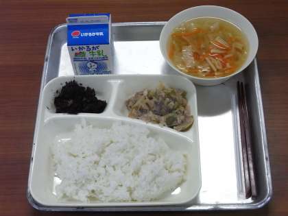 6月19日(金)、今日の給食のメニューは、「ごはん、豚肉のごまみそ焼き、すまし汁、のりのつくだ煮、牛乳」でした。