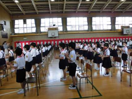歓迎のプレゼントとして、3年生の作ったメダルが、学級担任より一人一人の首にかけられました。1年生も上級生の気持ちに応えるかのように、リズム打ちをしながら、「がんばるぞ!」の気持ちを声に出して表しました。