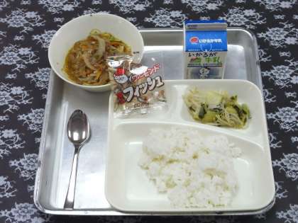 6月24日(水)、今日の給食のメニューは、「ごはん、マーボーはるさめ、チンゲンサイともやしの甘酢あえ、アーモンドフィッシュ、牛乳」でした。