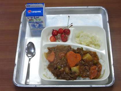 6月26日(金)、今日の給食のメニューは、「ハヤシライス、キャベツのゆずドレッシング、さくらんぼ、牛乳」でした。