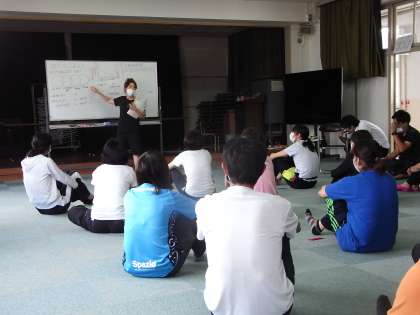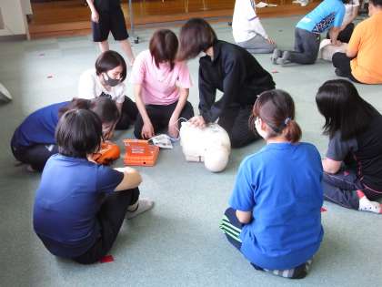 7月1日(水)放課後、教職員は、目の前で子どもをはじめ、人が呼吸や心臓が止まって倒れたとき、大切な命を一刻も早く救うために、胸骨圧迫(心臓マッサージ)とAEDによる電気ショックの行い方を中心に講習会をもちました。