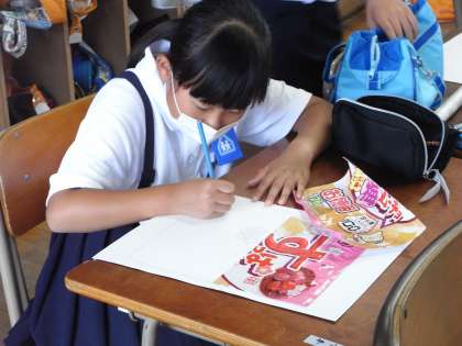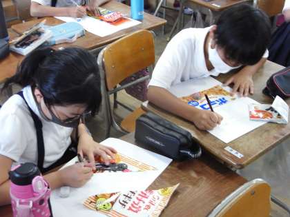 また、図画工作科では、お菓子の袋を本物そっくりに描いていきました。今日は、鉛筆で下書きです。うまく色づくりができるといいですね。