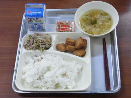 7月8日(水)、今日の給食のメニューは、「ごはん、ゴーヤチャンプルー、すまし汁、あつあげのしょうがじょうゆかけ、牛乳」でした。