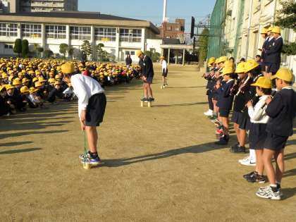 今日の児童朝会で運動委員会のみんなが「ぽっくり」の遊びの紹介をしました。木で作られたぽっくりは暖かみがあります。遊びを通して子どもたちの体力向上につながっていくと思います。