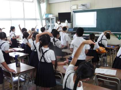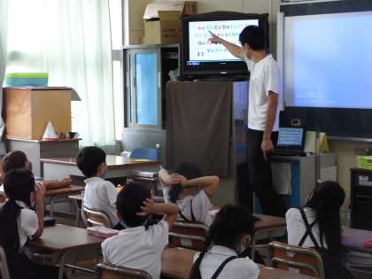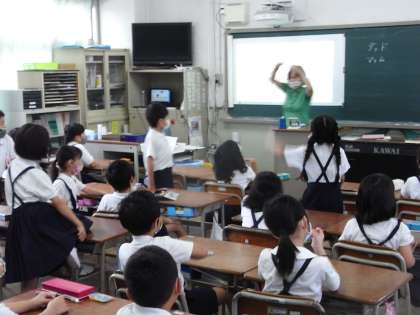 7月9日(木)、朝の会は、「小学校低学年からの英語教育」短時間学習の時間です。2年生は、アルファベットを繰り返し発音したり、アルファベットの形を体で真似てみたりしました。また、お父さん、お母さんを意味する「dad」「mom」も習いました。