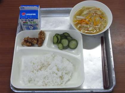 7月10日(金)、今日の給食のメニューは、「ごはん、豚肉の香味あげ、すまし汁、あっさりきゅうり、牛乳」でした。