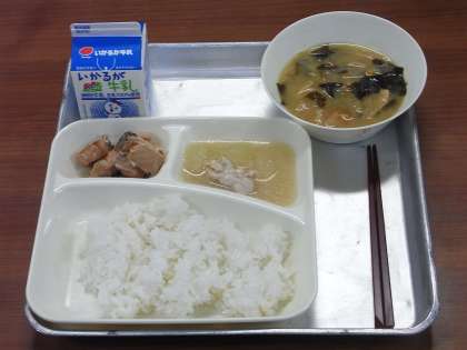 7月14日(火)、今日の給食のメニューは、「ごはん、さけのつけ焼き、みそ汁、とうがんの煮もの、牛乳」でした。